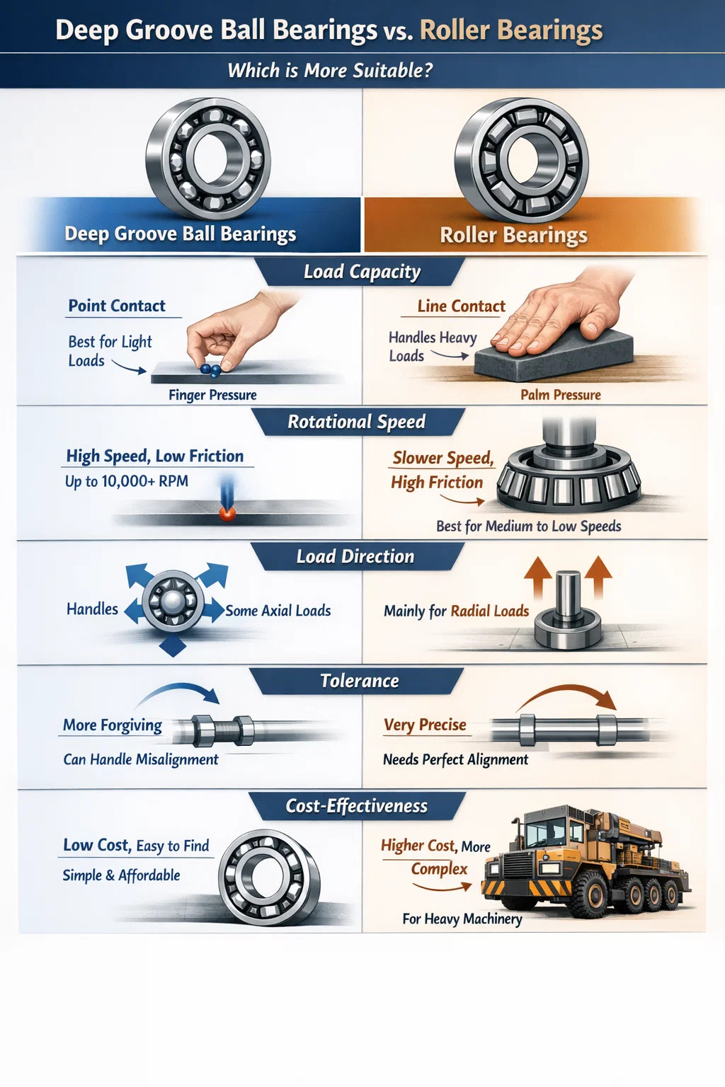 Galas penggelek: Penggelek di dalamnya berbentuk silinder atau kon, menghasilkan "sentuhan talian." Ini seperti menekan meja dengan tapak tangan anda berbanding menekannya dengan jari anda – bekas itu lebih kuat. Mereka sangat teguh dan boleh menahan berat dan impak yang besar.