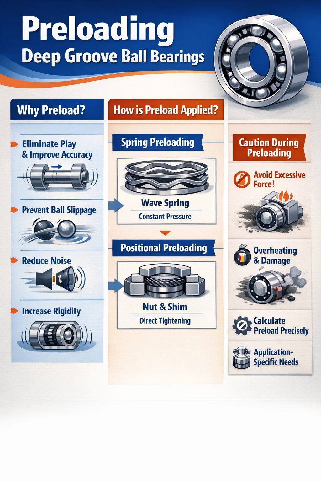 Menggunakan spring (pramuatan tekanan malar): Ini adalah kaedah yang paling biasa. Pegas gelombang atau spring gegelung diletakkan pada satu sisi galas, menolak gelang luar. Kelebihan kaedah ini ialah dayanya sangat stabil; walaupun bahagian mengembang atau mengecut akibat perubahan suhu, spring secara automatik mengimbangi.