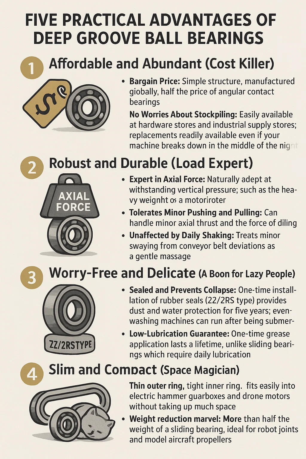 Pakar dalam daya paksi: secara semulajadi mahir dalam menahan tekanan menegak, seperti berat berat pemutar motor.