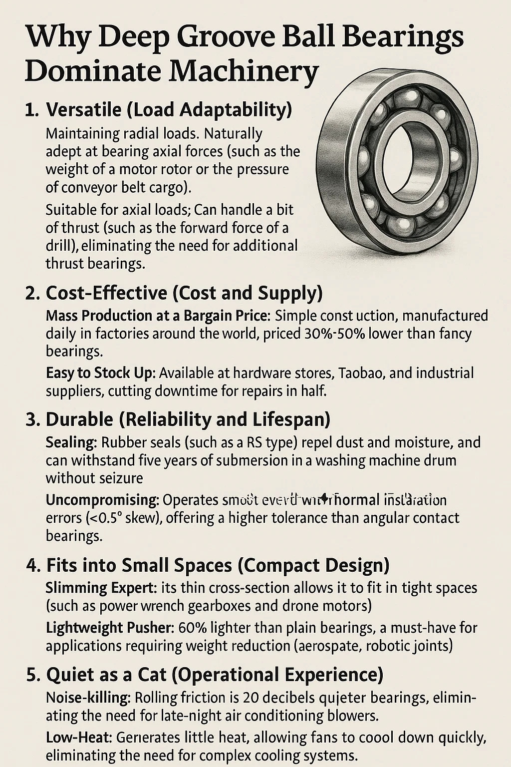 Pengedap: meterai getah (seperti jenis RS) menangkis habuk dan kelembapan, dan dapat menahan lima tahun penyerapan dalam drum mesin basuh tanpa sawan. Tidak kompromi: Beroperasi dengan lancar walaupun dengan ralat pemasangan biasa (<0.5 ° SKEW), menawarkan toleransi yang lebih tinggi daripada galas hubungan sudut.